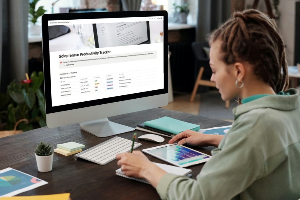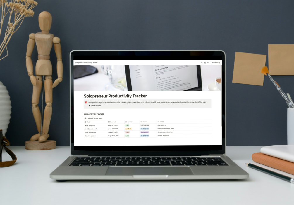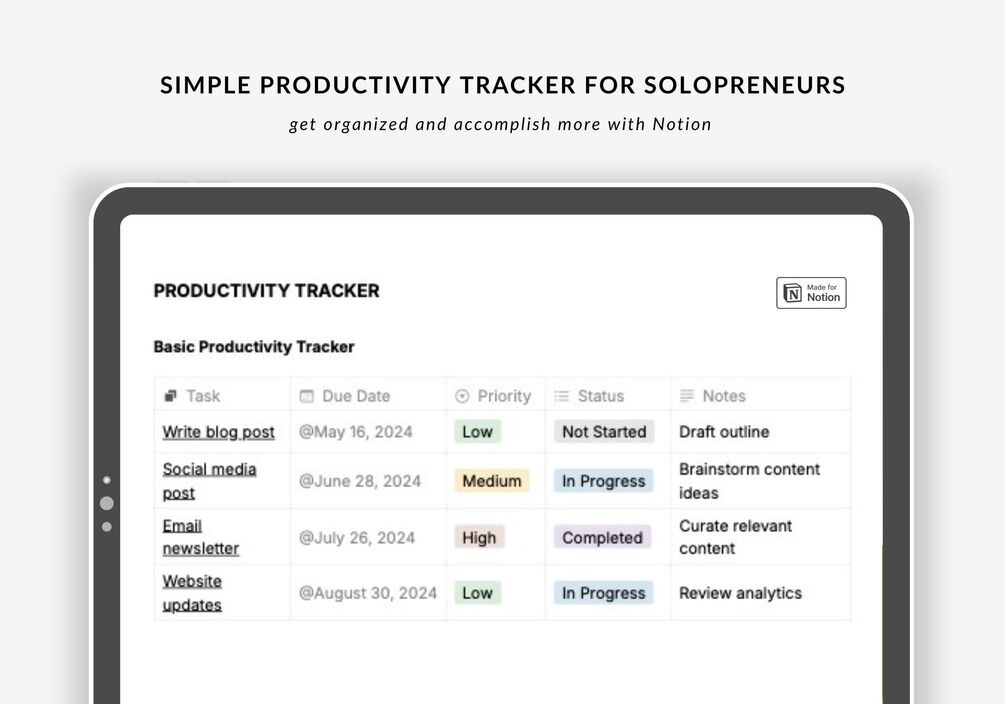Get organized and accomplish more with this easy-to-use Notion productivity tracker template. Whether you're a solopreneur, freelancer, or busy professional, this template helps to streamline your workflow and boost efficiency.